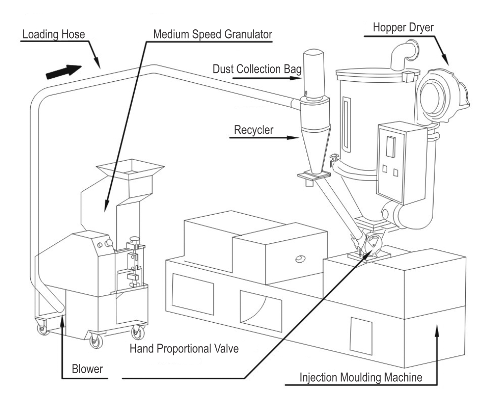 Despite its robust functionality, the Medium Speed Granulator – Online maintains a compact footprint, making it a space-saving addition to any workspace. The optimized design of the blade saddle further enhances its performance, ensuring efficient processing of sprues with minimal downtime.
